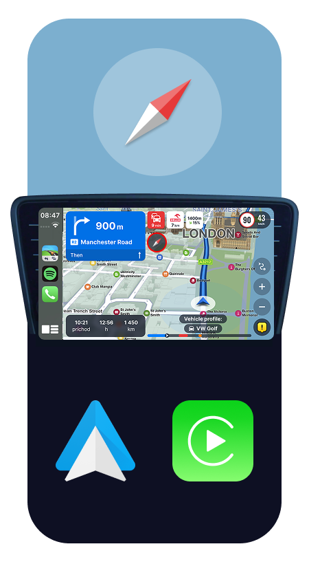 Sygic integriert einen Kompass direkt in die Anzeige der Wegweiser in Apple CarPlay und Android Auto.