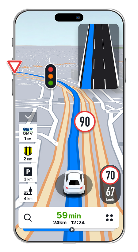 Sygic zeigt jetzt in Echtzeit direkt auf der Karte Warnungen für STOP-Schilder, Vorfahrt-gewähren-Schilder und Ampeln an. Damit können Sie: